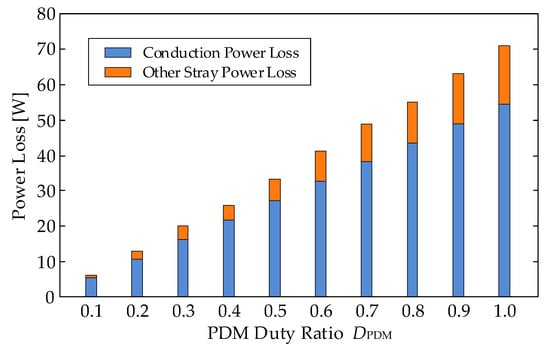 The conduction power loss calculations of the semiconductor are introduced into the simulation algorithm by these equations. Using the above equations in a circuit simulation, the conduction power losses of the diodes and IGBTs can be calculated. Additionally, using Equation (15) and the experimental results, other stray power losses of the reverse recovery losses of the diodes and switching power losses of the IGBT can be estimated separately from the inverter total power losses [,]. The power losses analysis results are given in Figure 11.