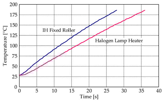 A comparison of the temperature rise characteristics of the halogen lamp and IH fixed roller heater is given in Figure 12. The graph clearly shows that the IH fixed roller temperature rise is significantly faster than that of the halogen lamp heater.