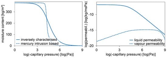 These moisture retention and permeability curves expose a number of abnormalities concerning the hygric characterisation of the OPS limestone. Firstly, the inversely characterized moisture retention deviates strongly from the moisture retention curve determined from mercury intrusion porosimetry. The latter has been determined with the Young–Laplace equation from the porosimetry results included in []’s supplementary material. This is a well-established technique [], and its accuracy has recently been reiterated []. Whereas the mercury-intrusion-based curve presents a (very) steep slope, in agreement with this limestone’s narrow 1–20 μm range of pore radii, the inversely characterized curve is far smoother, which does not concur with that narrow pore radii range. Secondly, the liquid and vapour permeability curves show that the liquid permeability always exceeded the vapour permeability, even at the very low capillary pressures and hence very low moisture contents. In the capillary pressure range from −108 to −109 Pa, representing relative humidity values between 0.1 and 50% and moisture contents of about 1 to 2 kg/m3 only, the liquid permeability is on average five times higher than the vapour permeability. This is unheard of, as it is widely accepted that vapour diffusion is the exclusive and dominant moisture flow mechanism at such low humidity []. When using these permeability curves for a simulation of a dry cup vapour diffusion test, the discusser acquires a moisture flow that translates to a vapour permeability δp of roughly 3 × 10−10 kg/msPa, 50% above the vapour permeability of air and about 40 times higher than typical limestone vapour permeabilities presented in the literature []. For that simulation, a 5 cm thick sample was placed in between environments at 54 and 12% RH, and the resulting steady-state moisture flow was translated to the reported vapour permeability.