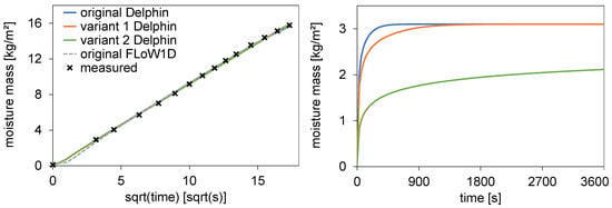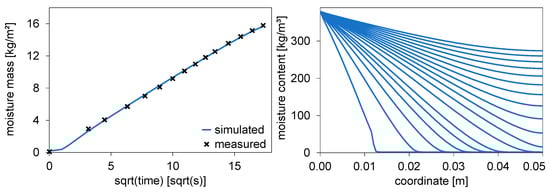The employed parameter values were obtained by fitting FLoW1D simulation results to the measured moisture mass evolution during a capillary absorption test. The resulting agreement of the simulated and measured moisture absorption is depicted in Figure 2 (left), and the resulting moisture content profiles as calculated with FLoW1D are shown in Figure 2 (right). Though the fit in Figure 2 (left) is acceptable, the moisture content profiles in Figure 2 (right) deviate from the sharp infiltration moisture fronts that are generally observed when building materials (certainly when having a narrow pore size distribution like the OPS limestone analysed here) undergo capillary absorption []. In [], moisture content profiles during capillary absorption in a limestone—with similar porosity but a smaller dominant pore radius (near 2 μm) and thus a smaller capillary absorption coefficient (about 0.15 kg/m2s0.5)—were visualized with neutronography, exposing very distinct moisture fronts (see []’s Figures 6 and 7). Finally, Figure 2 (right) shows that the moisture contents during capillary absorption reached the saturated moisture content, though these were typically limited to the capillary moisture content due to air entrapment []. For the limestone studied in [], the capillary moisture content was close to 220 kg/m3; in contrast, its saturated moisture content was about 400 kg/m3 (see []’s Figure 3).