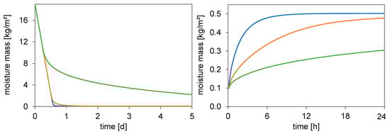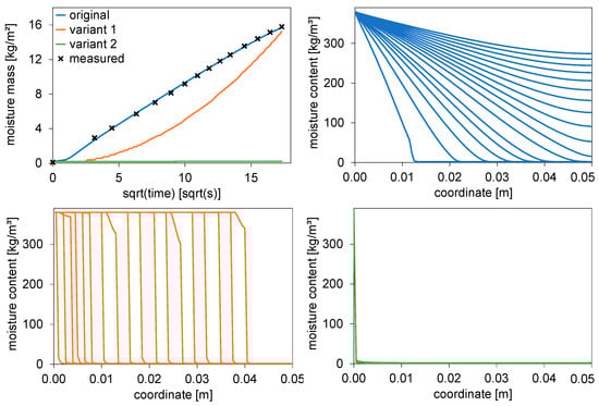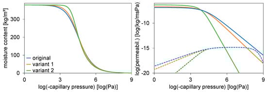 Though demonstrating the uniqueness of inverse characterisation procedures can be somewhat complex [,], establishing their non-uniqueness is far more straightforward. If it can be confirmed that multiple sets of parameter values all minimise the objective function, then it must be concluded that the characterisation is non-unique and hence unreliable. Table 1 shows three parameter value that all satisfactorily reproduce the capillary absorption. The first is []’s OPS limestone original, and the two others are variations. The changes in their parameters values primarily reflect somewhat steeper moisture retention curves, still centred though at the same capillary pressure as []’s original. The intrinsic permeabilities were subsequently calibrated such that the variants reproduce the capillary absorption. Figure 3 illustrates the resulting moisture retention and permeability curves. It should be noted that the two variants were deliberately kept quite similar to the original to demonstrate the large impacts of small deviations on the hygric response. Compared to the hygric properties for other building materials in the literature [,,,,,,], these are certainly not exceptional hygric property curves, implying that all are physically viable.