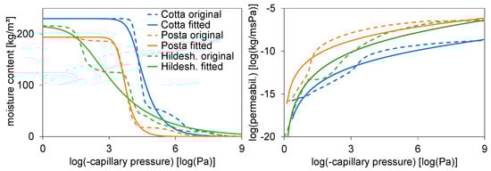Figure 5 shows the moisture retention and liquid permeability curves of three sandstones (Cotta, Posta, and Hildesheim), the properties of which were taken from the Delphin material database. The figure additionally depicts the unimodal van Genuchten-Mualem fits. For these, a least-squares-optimisation was executed, wherein deviations of saturation degree and liquid permeability were brough together in linear and logarithmic fashions, respectively. This confrontation of original and fitted data clearly reveals that van Genuchten-Mualem description was lacking, as it could not capture all complexities of the hygric properties of building materials. It should be noted that the original moisture retention curves, which were desorption curves, did not start from the saturated moisture content but instead from a lower effective maximum moisture content []. To not handicap the fitting from the start, these effective maximum moisture contents—which were lower than the saturated moisture contents—were adopted for the parameter fitting. It can also be shown that the use of bimodal van Genuchten-Mualem equations was not satisfactory. In the discusser’s experience, the van Genuchten-Mualem equations led to far better results when working with two or three modes while simultaneously employing independent parameters for the moisture retention and liquid permeability curves; however, this necessitates a far larger set of parameters [].