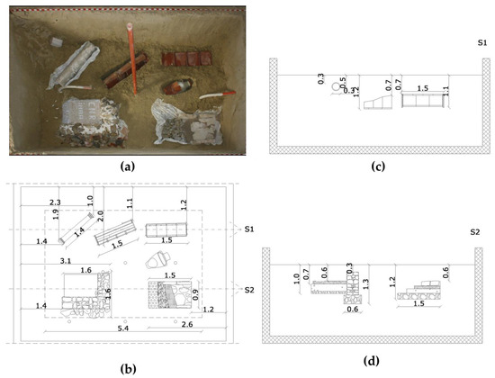 The archaeological framework reconstructed in the laboratory: (a) plan of remains (b) and transversal sections S1 (c) and S2 (d). The circles shown in the maps represent the positions of the piezometers and the numbers indicate the distance in meters. The pool is 12 m × 7 m × 3 m.