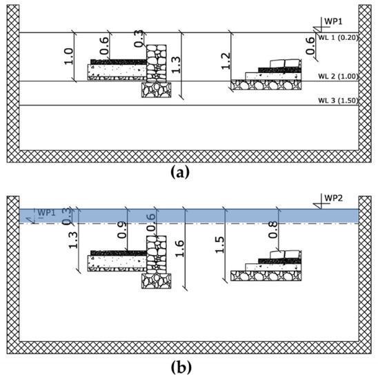 Figure 3. Two WPs were investigated: (a) WP1 with the water table placed at three different depths (respectively fixed to 0.20 m (WL1), 1.00 m (WL2) and 1.50 m (WL3); and (b) WP2, with the archaeological site covered by a water column of 0.3 m. The numbers indicate the distances in meters. - WP2: all the site was covered by water to reproduce an underwater archaeological site (Figure 3b).