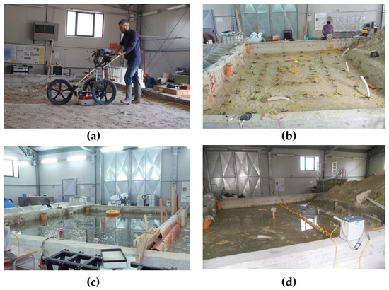 In this context, an archaeological site was reconstructed and buried by sand and different water content conditions were reproduced in order to simulate wet and lacustrine conditions typical of wetlands even assuming extreme events (for example, submarine landslide or fast coast natural erosion). For this experiment, a limited area of 6 m × 4 m (Figure 1b) inside the large pool was selected, and the archaeological features were buried until a depth of about 1.50 m from the original ground surface.