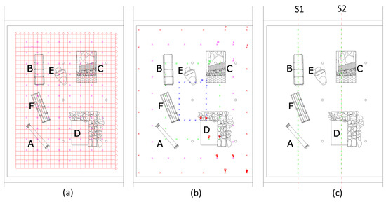 After the excavation activities, the area was filled with moist sand to obtain a quite homogeneous filling. We have proceeded layer by layer regularly compacting the sand by several cycles of tap water charge and discharge, from the bottom to the surface. In order to make the reconstruction as faithful as possible to real case, a study on the historical and archaeological area was carried out, taking in account the material used, the construction types, and techniques and methods of materials. The archaeological context was obtained following the dictates reported by ancient sources as those set forth by Vitruvio (De Architectura) and several studies published over time [89,90,91,92,93,94,95,96,97]. We adopted stylistic and structural elements belonging to different historical periods, places, and ethnos that find their coexistence in the middle Republican age and in the late-Imperial phase but even employed in more recent times, such as the capuchin tombs and ‘box-grave’ composed of large clay tegulae (tiles) used in the IV-III B. C. century but also in the Imperial period, or the opus coementicium (i.e., a hydraulic mortar laid in alternate courses with aggregate) continuously employed from its invention to the present time. In detail, it was involved in the construction of two different areas for the living context and funerary world, as shown in Figure 2b. A marble column, a capuchin burial, and a tiles burial were placed, as shown in Figure 2c along the S1 section (from left to right). Instead, along the S2 section as shown in Figure 2d (from left to right), part of a building and a paved road fragment were constructed. The building, defined by two dividing walls converging to form a corner, had incorporated a floor covered with mosaic; in this case, a small collapse near the structure was simulated. In Table 2, the electrical and em properties of the archaeological elements and background soil are presented.