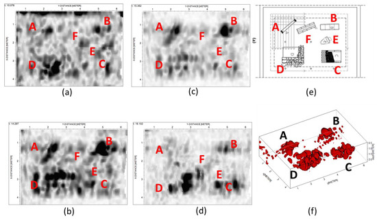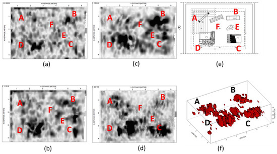 The third step was obtained with the water table level fixed at 0.20 m (WL1). This is the wetter scenario characterized by a em velocity of 0.07 mns−1 equivalent to a εr of 18.5. The results shown in Figure 8 highlight unequivocally the attenuation imputable to the fact that the objects are all underwater. Indeed, only the column (A), the top of the wall (D), the rectangular tomb (B), and the enchytrismos (E) are clearly detectable, whilst the capuchin tomb (F) and the paved road (C) are not easily detectable.