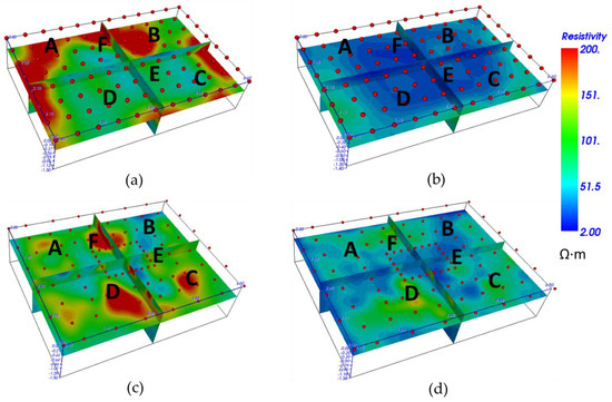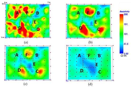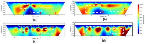 As shown in Figure 9, the resistivity values obtained with the use of the 3D-ERTs range between 2 and 200 Ωm. The low values of resistivity are due to the presence of a high-water content in the sand while the greater values are induced by the presence of the archaeological remains. The resistivity distribution acquired with the classical 3D ERT configuration is not associated well to the buried archaeological structures, both in the drier scenario (Figure 9a) and the wetter scenario (Figure 9b). On the contrary, the loop–loop array provided an enhanced information regarding their distribution and shape (Figure 9c,d). In fact, several resistivity anomalies are well detected in the loop–loop 3D ERT image and they clearly highlight the presence of the corner wall (D), the capuchin tomb (F), and enchytrismos (E), as shown in the wetter scenario WL2 (Figure 9d). Less evident is the presence of the other structures that are located at the edges of the investigated area (column A and rectangular tomb B) or at a greater depth, as in the case of the paved road (C).