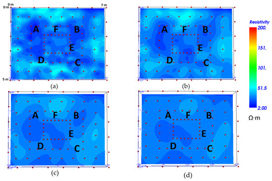2D ERTs obtained on S1 and S2 with floating (a,b) and underwater (c,d) electrodes using the dipole–dipole Array (the inversions are performed with ResIPy).