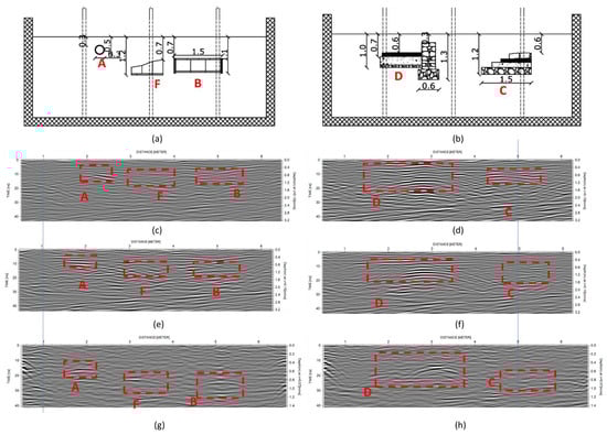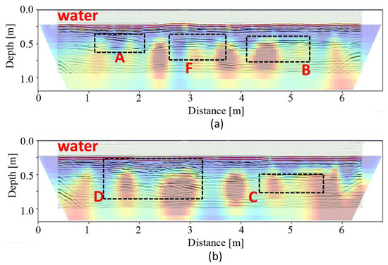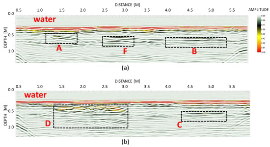 Even with the presence of water-saturated soil and the water column, the reflections imputable to the column (A), the stone wall (D), and the top of the two tombs (F and D) are clearly individuated (Figure 13a,b) while the top of the road (C) is weakly identifiable.