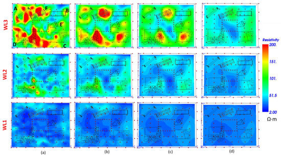 The results obtained with the water table at the depth of 1.00 m (in WL2) allow to detect a lower noise in the shallowed layers due to the higher water content in the subsoil (Figure 11), resulting in an improved geophysical contrast between the archaeological structures (more resistive) and background soil (more conductive). As in the previous case, apart from the rectangular tomb (B), the electrical anomalies can be associated for position and shape to the buried structures at the depths of 0.25 m (Figure 11a), 0.45 m (Figure 11b), and 0.70 m (Figure 11c).