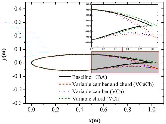 RAE 2822 supercritical airfoil is regarded as the baseline airfoil (identified as BA in the following). The baseline airfoil’s chord length is 1 m, and has the max thickness 12.11% at 37.9% chord. The simultaneous variable-camber and variable-chord airfoil (identified as VCaCh in the following) is obtained by translating the airfoil section after 70% chord length of the baseline airfoil by 5% chord length, and then deflecting the airfoil section from 90% chord length of the original airfoil to the trailing edge by a specified angle (upward deflection is negative and downward deflection is positive) when taking the thickness midpoint at 70% chord length of the baseline airfoil as the rotation axis. Finally, the airfoil section from 50% to 90% chord length is replaced by a smooth curve (in reality, this smooth curve is realized by flexible structure and flexible skin [,,]; in a computational model, this smooth curve is realized by geometry software) so that a geometric model of variable camber and variable chord is obtained. The variable-camber airfoil (identified as VCa in the following) deflects the airfoil section from 90% chord length of the original airfoil to the trailing edge and the rotation axis is the same as VCaCh, then the airfoil section from 50% to 90% chord length is replaced by a smooth curve. The variable-chord airfoil (identified as VCh in the following) is obtained by translating the airfoil section after 70% chord length of the baseline airfoil by 5% chord length, then the airfoil section from 50% to 90% chord length is also replaced by a smooth curve. The above four airfoils are shown in Figure 1. In fact, there are mature implementation schemes to achieve the variable camber and variable chord mentioned above. For example, the ACTE technology uses compliant structures to make changes in wing trailing-edge shape with smoothly curved surfaces along the flow direction []. The variable chord can be realized by using the telescopic wing scheme, and the NextGen Company proposed the concept of sliding skin and conducted flight tests in which the chord length can be varied by up to 110% [].