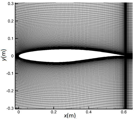 As a classical two-dimensional transonic flow simulation validation case, the RAE 2822 airfoil case is widely selected as a numerical simulation method validation case [,]. In this case, the Mach number of Case 9 in an original wind tunnel experiment [] is 0.73, the angle of attack is 3.19°, and the Reynolds number based on chord length (c = 0.61 m) is 6.5 × 106. Here, the modified data [] (Ma = 0.734, AOA = 2.79°, Re = 6.5 × 106) are selected for verification and validation.