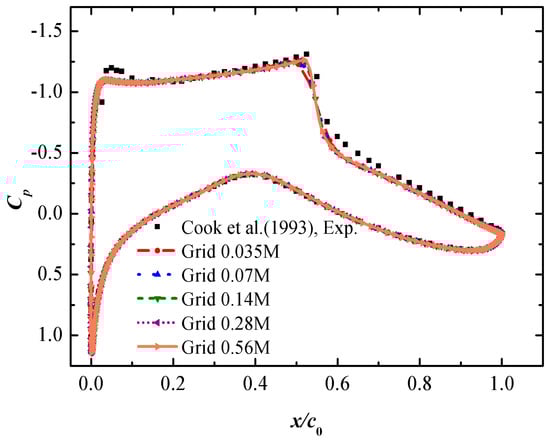 Table 2 shows the aerodynamic coefficient of different grids. The difference between the aerodynamic coefficient of the 14.0 × 104 grid and the 28.0 × 104 grid is less than 0.17%, which indicates that grid independence has been well achieved. It is verified that the numerical results obtained are independent of the density of the grid through the research of grid independence. Figure 3 shows the pressure coefficient Cp distributions on the airfoil surface resulting from numerical simulations and a wind tunnel experiment. The pressure coefficient distributions of the five grids are relatively close, but the shock waves captured by the 3.5 × 104 and 7 × 104 coarse grids are relatively inaccurate. Combining the results of Cp and aerodynamic coefficient, it is clear that the 14.0 × 104, 28.0 × 104, and 56.0 × 104 grid cells could well reflect the flow state of the flow field, which confirms the accuracy of the numerical simulation method. On the premise of ensuring accuracy, the variable-camber and -chord-length airfoil will be investigated with 14.0 × 104 grid cells to save computational resources.