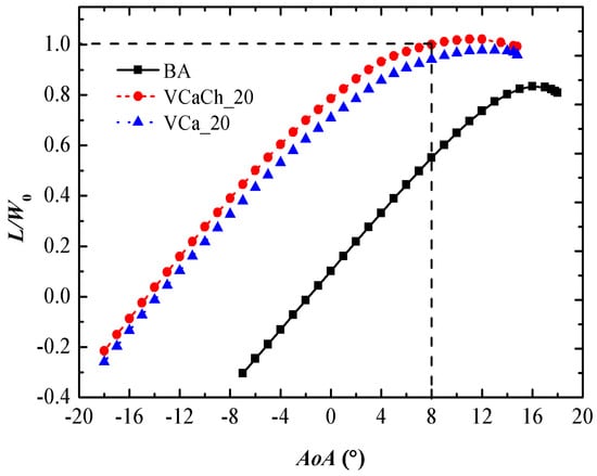 An aircraft has the largest weight at take-off state. Therefore, it is necessary to adopt high lift devices to increase lift. Trailing-edge deflection can significantly increase the lift of the airfoil. Therefore, the aerodynamic characteristics of simultaneous variable-camber and chord-length airfoil (VCaCh) and variable-camber airfoil (VCa) were compared (the deflection angle of the trailing edge of both airfoils is 20°). Figure 4 shows that stalling angle of the VCaCh airfoil is about 12°, supposing that the lift L when the attack angle AoA is 8° is equal to the required lift for takeoff, which is also equal to the take-off weight W0. The curves in Figure 4 indicate that the variable-camber airfoil significantly improves the maximum lift compared with the baseline airfoil (BA), and the lift improvement effect of VCaCh airfoil is better than that of VCa airfoil.
