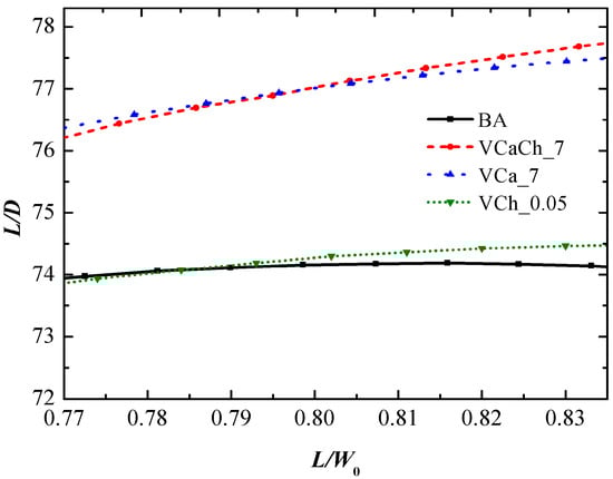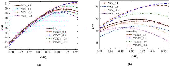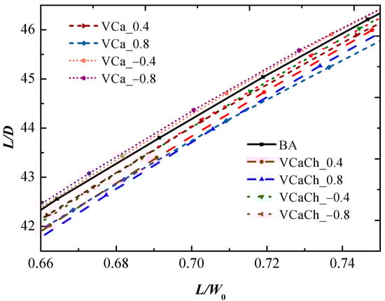 The lift–drag ratio is an essential aspect of morphing-benefit research as it can represent the flight aerodynamic efficiency and is a key parameter to be considered when an aircraft is in cruise state. Figure 5 shows the variation of L/D with L/W0 of VCaCh, VCa, and BA airfoil with different trailing-edge deflection angles at Ma = 0.734. The effects of the trailing-edge deflection angle of the morphing airfoil on the lift–drag ratio differ under different L/W0 ranges, as shown in Figure 5a. This study mainly compares the difference in lift–drag ratio under different L/W0 ranges throughout the designed flight stages. Therefore, Figure 5a was partially enlarged to obtain Figure 5b. The required lift range is 0.96~0.84W0 under the first high-speed cruise stage of flying to the destination. Figure 5b shows that the VCaCh morphing method can increase the lift–drag ratio whether with upward deflection or downward deflection, and the upward deflection effect is more significant. The increment of morphing airfoil that can improve the lift–drag ratio will raise with the increase in L/W0. VCaCh_0.4 airfoil is more excellent than VCaCh_0.8 airfoil in the range of L/W0 = 0.84~0.91, but it is the opposite in the range of L/W0 = 0.91~0.96. However, the VCa morphing method does not improve the lift–drag ratio under this stage, whether the trailing edge deflects upward or downward.