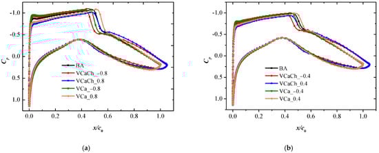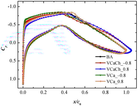In Table 3, the lift–drag ratios of morphing airfoil and baseline airfoil are compared and the drag decomposition is conducted when the typical L/W0 = 0.95 is selected, so that the difference in lift–drag ratio of the morphing airfoil can be compared in more detail and the drag-reduction mechanism can be analyzed. The VCaCh_0.8 airfoil improves the lift–drag ratio by about 3.07% compared with BA airfoil, but VCa_0.8 airfoil fails to increase. From the results of drag decomposition, the friction drag Dfriction of VCaCh airfoil is greater than VCa airfoil, while the pressure drag Dpressure is significantly smaller than VCa when the deflection angle is the same. The pressure drag difference between the two morphing methods is larger than the friction drag difference, so the total drag Dtotal of VCaCh is smaller than that of VCa airfoil at this time, and the pressure drag is actually the reason that the total drag of VCaCh airfoil decreases compared with BA airfoil.