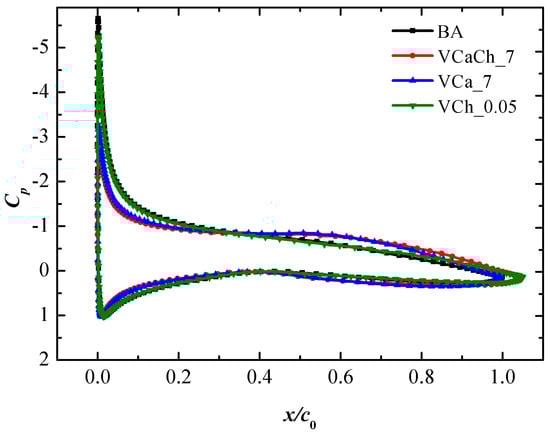 Figure 8 shows the variation of L/D with L/W0 of VCaCh and VCa airfoil with a trailing-edge deflection angle of 7°, VCh airfoil, and BA airfoil at Ma = 0.3. There are differences in lift–drag ratio among the three morphing methods under different L/W0 ranges, as shown in Figure 8. The results indicate that VCh morphing method can sightly improve lift–drag ratio compared with BA airfoil during the designed low-speed flight stage (L/W0 = 0.835~0.775), while VCaCh and VCa morphing methods have significant improvement. Besides, the VCaCh morphing method is better than VCa under the range of L/W0 = 0.805~0.835. In Table 4, the drag decomposition and lift–drag ratio of morphing airfoil are compared with that of BA airfoil at L/W0 = 0.83. Under this state, the lift–drag ratio of VCaCh_7 airfoil is increased by 4.82%, which is 0.22% higher than that of VCa_7 airfoil. From the analysis of drag decomposition, the friction drag of the three morphing airfoils is higher than that of the BA airfoil and the order is VCaCh > VCa > VCh > BA. This demonstrates that the simultaneous variable-camber and variable-chord method will increase friction drag compared to the variable-camber or variable-chord method. Besides, the pressure drags of the three methods are all reduced and the order is BA > VCh > VCa > VCaCh. Observing the pressure coefficient distributions in Figure 9, we find there is no shock wave at low speed, which means there is no shock-wave drag among pressure drag, and therefore all the pressure drag could be considered as form drag. Therefore, it can be concluded that both VCaCh and VCa airfoils obviously improve the lift–drag ratio by reducing the form drag during low-speed stage.