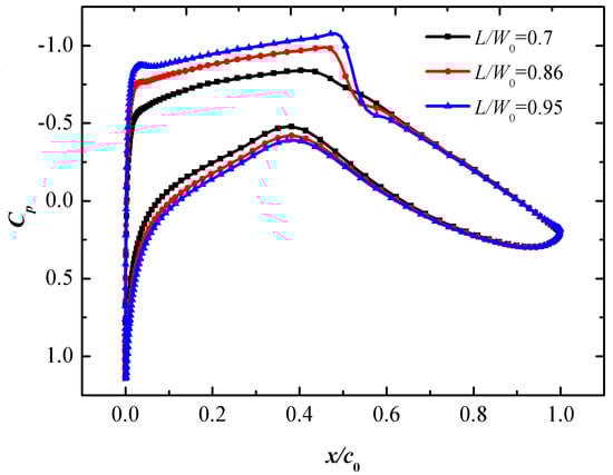 Figure 11 shows the pressure distribution of BA airfoil under different L/W0 at Ma = 0.734. With the decrease in L/W0 (attack angle decreases), the leading-edge suction peak value decreases, the position of shock wave moves forward, and the shock wave is weakened. Furthermore, the shock wave of the BA airfoil is significantly weak when L/W0 = 0.7. According to the pressure coefficient distributions of morphing airfoil at L/W0 = 0.7 in Figure 12, the shock wave of VCaCh_−0.8 airfoil is weakened little compared with the BA airfoil, which has little influence on shock-wave drag. Therefore, the decrease in pressure drag of VCaCh_−0.8 airfoil is not enough to offset the increase in friction drag. The shock-wave strength of VCaCh_−0.8 airfoil is equivalent to that of the BA airfoil, which means its pressure drag decreases mainly because of the more obvious decrease in form drag.