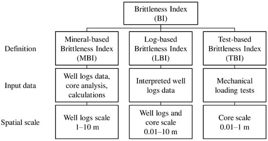 Different empirical formulas for calculating the brittleness index exist that is due to different scale of problem consideration. Therefore, different experimental data available at the respective scale are used for the brittleness estimation. This provides a variety of formulas for brittleness definition. In this paper, the definitions are classified according to the input data and scale. Three types of BI definitions are analyzed—mineral-based (MBI), log-based (LBI), and test-based (TBI).