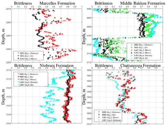 Symbols represent predicted brittleness using the correlations proposed by authors mentioned in the legends with respect to equations in the current paper. Several important points can be seen from the figure. First of all, brittleness indices vary a lot. Normalization procedures represented by Equations (5) and (9) lead to the interval of possible brittleness indices to be between zero and one. It will be shown below that this normalization is not a tool to make things simpler, but an important way to make different indices comparable. Secondly, even within this interval, brittleness indices obtained from different correlations show varying behavior. The results obtained for middle Bakken and Niobrara formations reveal the same tendencies in different indices, i.e., zones of maximum values of different brittleness indices are in agreement. The same is not true for Marcellus and Chattanooga formations. It can be clearly seen from the figure that some brittleness indices show, in fact, opposite behavior: an example is depth interval between 2284 and 2290 m for Marcellus formation. In this interval, the zones of maximum LBI2 coincide with zones of minimum MBIs, and vice versa. Moreover, this difference is not within the confidence interval: it is typical for the indices introduced in the mentioned papers to have an error of ±0.1 [21], which is lower than the differences between brittleness indices plotted in Figure 2.
