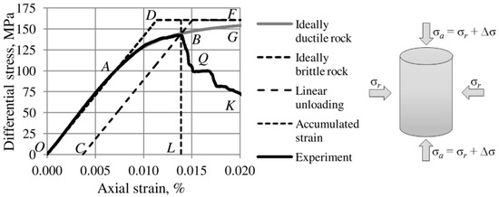 Figure 3 represents the typical result of single-stage loading test: a cylindrical sample is subjected to axial effective stress σa and radial effective stress σr. Radial stress is maintained at a certain level, while axial stress is gradually increased until the failure of the sample. Differential stress Δσ = σa − σr and axial and radial strains of the sample εa and εr are the parameters of stress–strain state of the sample obtained at any point of time during the test. Experimentally obtained axial strain dependency on differential stress plotted as a solid black line in Figure 3 is generally used to evaluate brittleness. This line has certain specific zones: linear elastic sector OA, inelastic strain accumulation AB, failure point B, post-peak rupture BQ, and relaxation zone QK. Specifics of behavior of the rock in these regions are used in many studies to estimate test-based brittleness indices (TBIs).