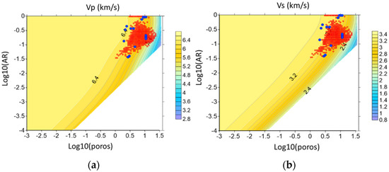 (a) Compressional and (b) shear wave velocities for a model of calcite matrix with randomly oriented brine-saturated voids versus decimal logarithms of porosity (poros) and void’s aspect ratio (AR). Red signs show values for West Siberian limestones. Blue signs are used for limestones from layers within a shale formation [54].