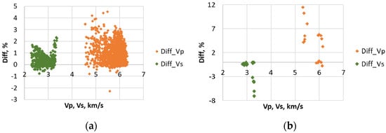 Relative difference (Diff) between the theoretical and experimental values of compressional (orange signs) and shear (green signs) wave velocities. (a) West Siberian limestones and (b) limestones from layers within a shale formation [54]. The horizontal axis shows experimental velocity values.