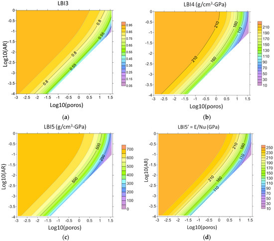 Brittleness indices (a) LBI3, (b) LBI4, (c) LBI5, and (d) LBI5′ for a model of carbonate matrix with randomly oriented brine-saturated voids versus decimal logarithms of porosity and void’s aspect ratio.