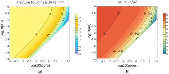 (a) Fracture toughness and (b) critical strain energy release GC versus decimal logarithms of porosity and void’s aspect ratio.