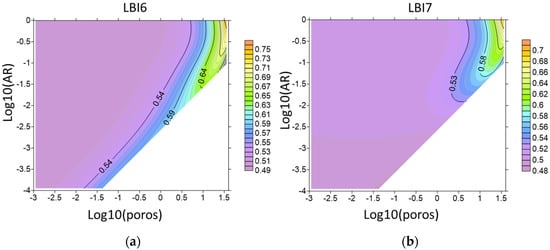 As seen, all the indices show a similar behavior. They decrease as the porosity increases and increases with void’s opening, which is in agreement with LBI1 behavior. Among the indices, the LBI5 is more variable whereas the smallest variability is observed for LBI3. Similar behavior is observed for LBI8 (Figure 8). Its variability is comparable to LBI3.