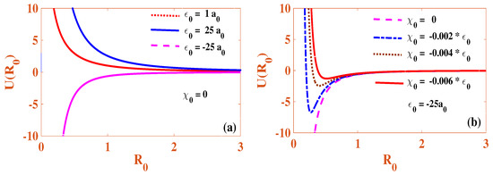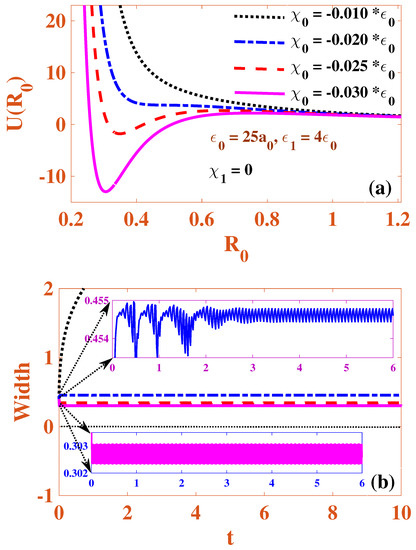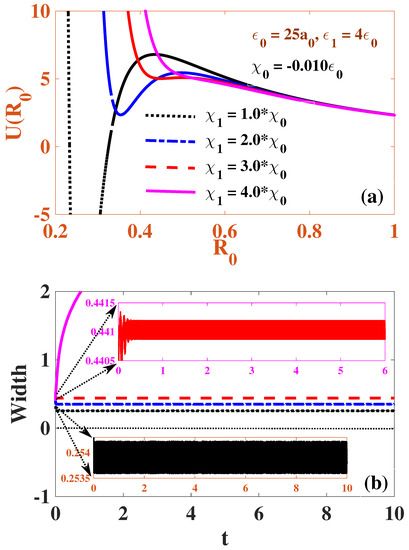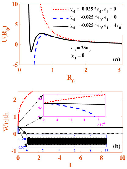 In Figure 1, we display the effective potential (19) of the Cr condensate in the absence of the temporal modulation of both nonlinearities. One may infer from Figure 1a that the potential energy curves do not show any minimum for both repulsive (dotted and solid curves) and attractive (the dashed curvation) () strengths. In the repulsive case, this indicates that the condensate leads to expansion due to the repulsive two-body interaction and the kinetic pressure. On the other hand, no stable equilibrium point (i.e., potential minimum) exists for the attractive case either, which indicates that the attractive constant two-body interaction overcomes the kinetic pressure, leading to the collapse of the condensates. These conclusions are commonly known for the cubic GP/nonlinear-Schrödinger equation in 2D [61].