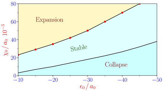 Next, in Figure 1b, we show how the interplay between the two- and three-body collisions along with the DD interaction can lead to a stable condensate. We first get back to one of the potential curves in Figure 1a for the attractive case corresponding to , , , . In this case, the absence of a repulsive force to balance the self-attraction force arising due to the constant part of the two-body and DD interactions initiates the collapse of the condensates. Now, the combined impact of the repulsive force arising due to the repulsive three-body interaction safely counterbalances the self-attraction as is evidenced by the presence of the potential minima in the respective curve in Figure 1b while the nonlinearity management is not included. Further, in Figure 2, we show the stability domains in the plane of the constant parts of the attractive two-body interaction in competition with repulsive three-body interactions. The diagrams show stable regimes between the collapse and expansion regions. From Figure 1 and Figure 2, we conclude that with help of the repulsive three-body interaction, one can stabilize the trapless DBEC with attractive two-body interaction. This has been done without the contribution of the oscillatory part of the contact interactions.