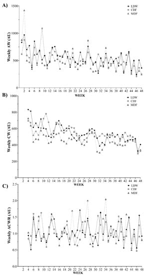 Descriptive statistics of (A) acute workload (AW), (B) chronic workload (CW), (C) acute: chronic workload ratio (ACWR), and their variations across the full season, considering the weekly averages of body load. AU, arbitrary units; LDW, lateral defenders and wingers; CDF, central defenders and forwards; and MDF, midfielders.