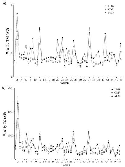 Figure 6 displays an overall vision of the wTM and wTS variations across the full season by play position. The highest wTM occurred in weeks 2, 34, and 12 for lateral defenders and wingers, central defenders and forwards, and midfielders, respectively, while the lowest wTM were observed in weeks 29, 30, and 11 for lateral defenders and wingers, central defenders and forwards, and midfielders, respectively (Figure 6A). Coincidentally, the highest wTS happened in week 2 for all player groups. Moreover, the lowest wTS were observed in week 46 for lateral defenders, wingers, central defenders, and forwards, while midfielders showed the lowest wTS in week 29 (Figure 6B).