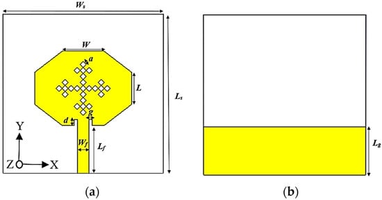 The first step in the design of the suggested antenna is displayed in Figure 2a. A rectangular microstrip antenna of length Lp and width Wp was taken as a reference antenna (simple microstrip patch). The dimensions of the rectangular radiator were determined using the theory of transmission lines using the following Equations (1)–(4) []: