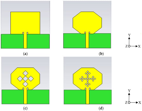 Evolution process of the suggested antenna: (a) simple microstrip patch (STEP I), (b) truncated patch (STEP II), (c) slotted patch (STEP III), (d) suggested patch (STEP IV).