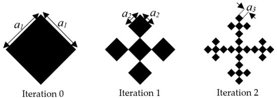 The construction of Vicsek fractal slots is based on square rotated by π/4 and decomposed into nine squares. The four corner squares and the middle square are kept, while the remaining squares are eliminated, as illustrated in the Vicsek fractal [] with: