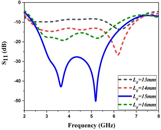 Figure 6. By changing the length Lg from 13 to 16 mm, the bandwidth increases from 1.5 GHz to 4.35 GHz. Moreover, it is seen that the optimal value of the length of the ground plane is Lg = 15 mm, for which the suggested antenna achieves the desired broadband with good impedance matching.