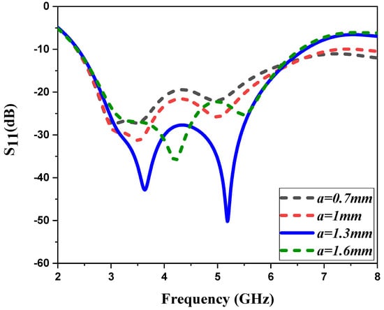 The parametric study in this section looks into the effect of the length of the Vicsek fractal slot on the impedance bandwidth and on the resonant frequencies. Figure 7 depicts the variation of S11 when the length a of the Vicsek fractal slot is changed and all other dimensions remain constant. It can be claimed from the figure that the parameter a has no effect on the suggested antenna’s impedance bandwidth but it does change the position of the resonant frequencies. The range of this parameter (a) is between 0.7 and 1.6 mm. Additionally, the value a = 1.3 mm is found to provide satisfactory impedance matching in the 3.6 and 5.8 GHz frequencies corresponding to the WLAN and WiMAX bands.