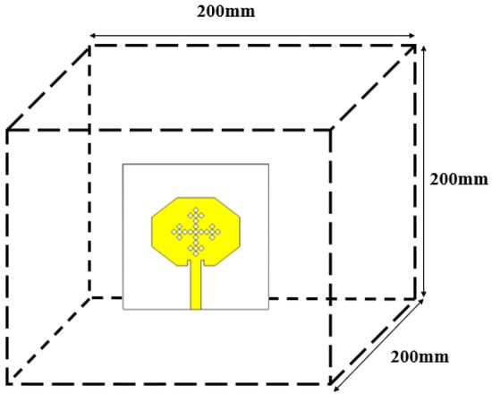 The corresponding simulated S11 of the different steps of the design process of the investigated antenna is depicted in Figure 3. The simple microstrip patch antenna generates one resonant frequency at 7.4 GHz, and it provides a bandwidth of 1.5 GHz. The truncated patch antenna structure is obtained by cutting four triangular shapes in the four angles of the radiating element to obtain an octagonal patch antenna as depicted in Figure 2b. It is noticed from Figure 4 that the truncated patch antenna provides a broadband of 3.91 GHz from 2.29 to 6.2 GHz with one resonant frequency at 3.8 GHz.