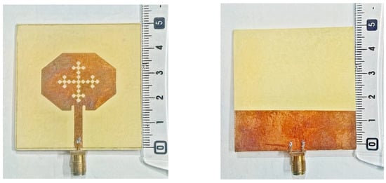 - Reha, A.; El Amri, A. Design, Realization and Measurements of CPW-Fed Miscrostrip Hexagonal Patch Antenna with H-Tree Fractal Slots for WLAN and WIMAX Applications. IJMOT 2016, 11, 251–258. [Google Scholar]