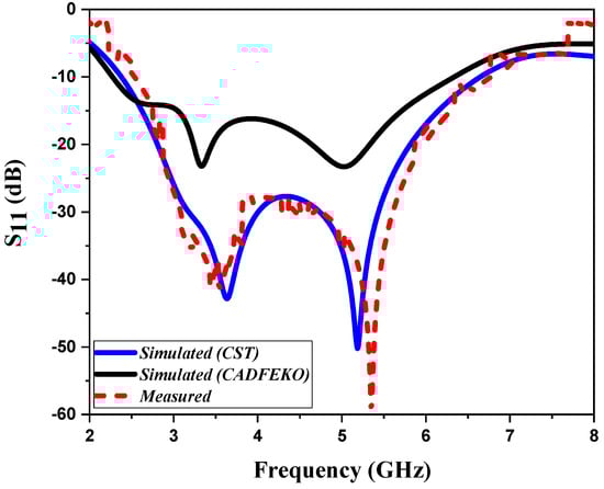 The simulation results obtained by the CADFEKO and CST solvers, as well as the measurement results, are collected and summarized in Table 2. The impedance bandwidth is 4.15 GHz with two operating frequencies 3.5 and 5.1 GHz for CADFEKO, and the impedance bandwidth is about 4.35 GHz with two resonant frequencies at 3.6 and 5.2 GHz for CST. The measured impedance bandwidth is 4.22 GHz, with two operating frequencies at 3.6 and 5.3 GHz. In addition, when evaluating gain values, the CST result is 2.75 and 5.37 dBi at 3.6 and 5.2 GHz, respectively. In addition, the CADFEKO result is 2.63 and 5.26 dBi at 3.5 and 5.1 GHz, respectively, and the measured gain value was around 2.78 and 5.32 dBi at 3.6 and 5.3 GHz. As a result, for the impedance bandwidth, resonant frequencies and gain comparison, the CST produced results that were closer to the measured results. The CST based on the FIT approach produced a better outcome for broadband antennas, as predicted by the literature [].