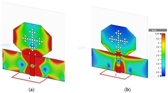 The slotted patch antenna presents a broadband of 4.3 GHz from 2.3 to 6.6 GHz with two resonant frequencies at 3.55 and 5.3 GHz with reflection coefficients −42 dB and −40 dB, respectively. Finally, the geometry of the suggested antenna is obtained by introducing the second iteration of Vicsek fractal slots on the octagonal patch antenna, as shown in Figure 2d. The suggested antenna achieves a broadband of 4.35 GHz from 2.3 to 6.65 GHz with good impedance matching at resonant frequencies 3.6 and 5.2 GHz.