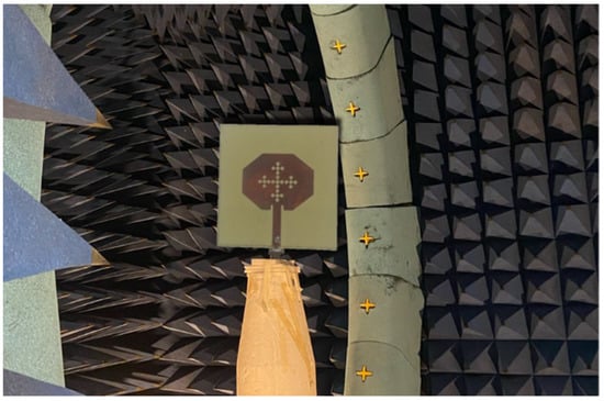 The measurement setup of radiation pattern and gain in an anechoic chamber.