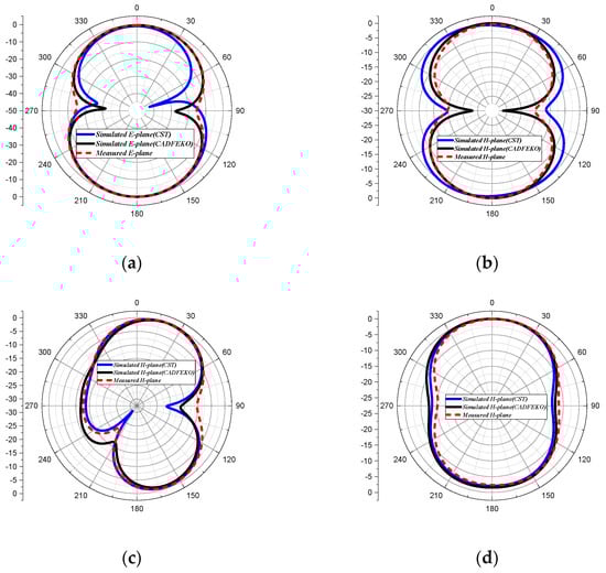 Two-dimensional radiation patterns: (a) E-plane at 3.6 GHz, (b) H-plane at 3.6 GHz, (c) E-plane at 5.3 GHz, (d) H-plane at 5.3 GHz.