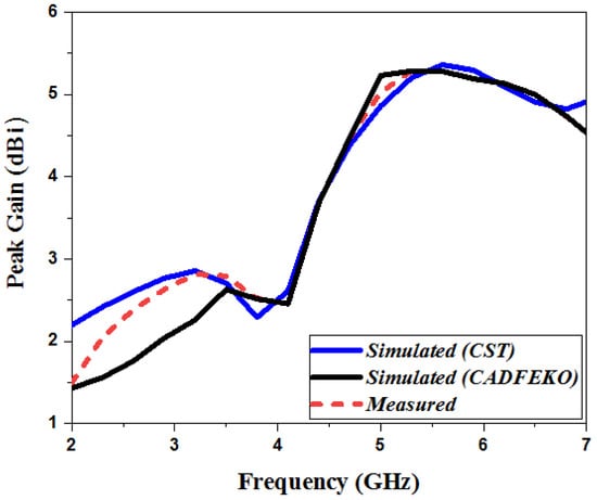 Simulated and measured peak gain of the suggested antenna versus frequency.