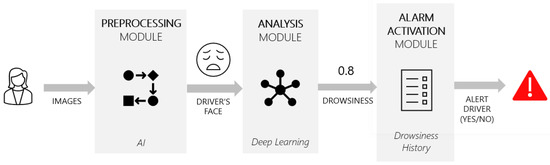 These images are received by the preprocessing module, whose objective is to transform the received image into data that can be used by the drowsiness detection model. The preprocessed data are then sent to the analysis module, which performs the fatigue detection tasks and assesses the level of drowsiness of the driver at that moment, based on the information from the last 60 s. Lastly, the calculated drowsiness level is transmitted to the alarm activation module, which uses the last levels of drowsiness to determine whether it is necessary to alert the driver or not.