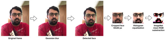 After this, we scale the face to 64 × 64 px, a size that allows us to preserve the details of the face and considerably reduces the computation time required to process each image. Next, we perform a histogram equalization to adjust the contrast of the image and avoid unnecessary details. We apply ImageNet mean subtraction [7], a technique that reduces the probability that the classification is affected by the illumination of the image, and that allows to use transfer learning with models that have been trained over the ImageNet domain. Figure 3 shows an example of the preprocessing that is performed.