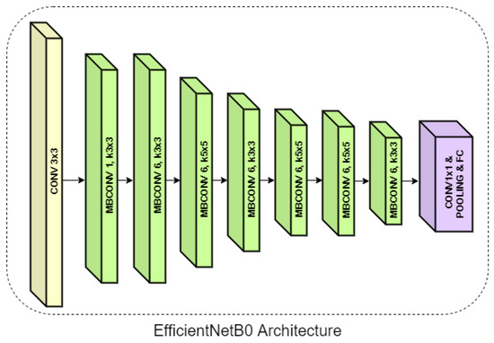 The EfficientNetB0 architecture is divided into 9 blocks, each of them formed by multiple layers. Figure 4 shows an overview of this architecture, where the 9 main blocks are represented.